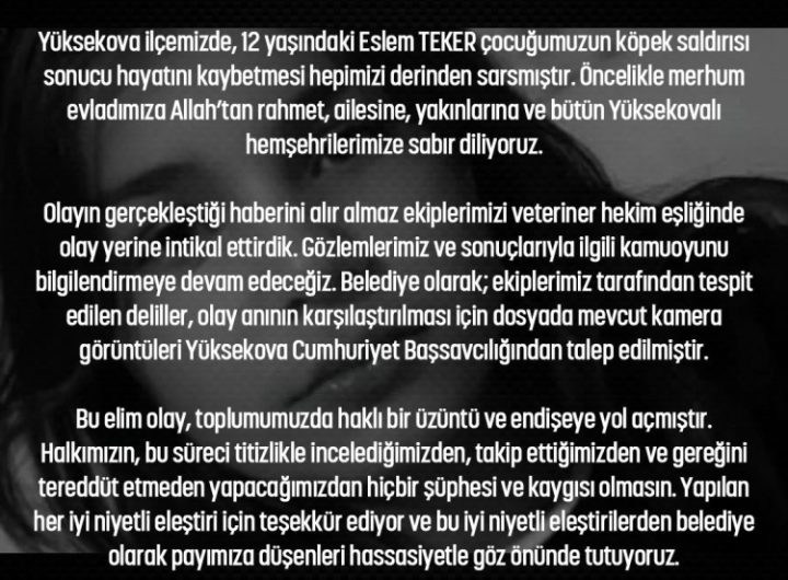Tarım ve Orman Bakanı İbrahim Yumaklı, Hakkari’nin Yüksekova ilçesinde 12 yaşındaki Eslem Teker’in sahipsiz köpeklerin saldırısı sonucu...