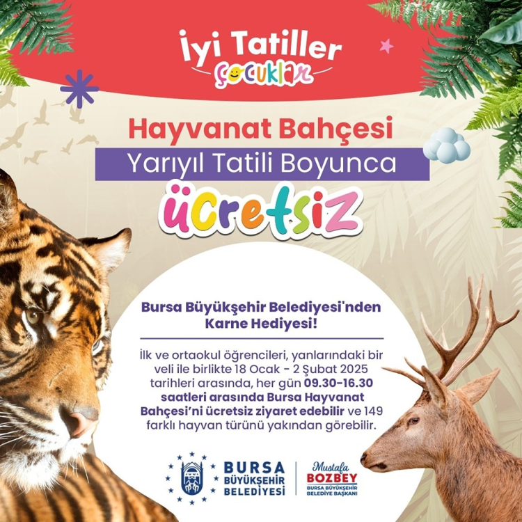 Bursa Büyükşehir Belediyesi, 2024-2025 eğitim döneminin ilk yarısını tamamlayıp, sömestir tatiline giren tüm öğrencilere ücretsiz hayvanat bahçesi gezisi hediye etti