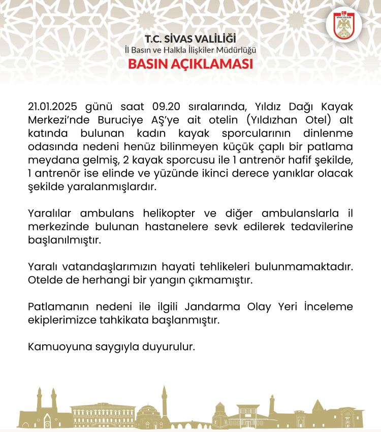 Sivas Valiliği’nden yapılan açıklamaya göre, saat 9.20 sıralarında patlama Sivas İl Gençlik ve Spor Müdürlüğü’ne bağlı sporcuların konakladığı otelde yaşandı.