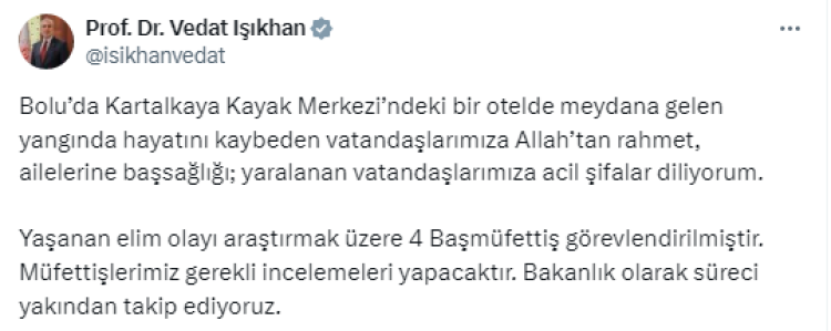 Çalışma ve Sosyal Güvenlik Bakanı Vedat Işıkhan, Bolu Kartalkaya’daki yangınla ilgili 4 başmüfettişin görevlendirildiğini açıkladı.