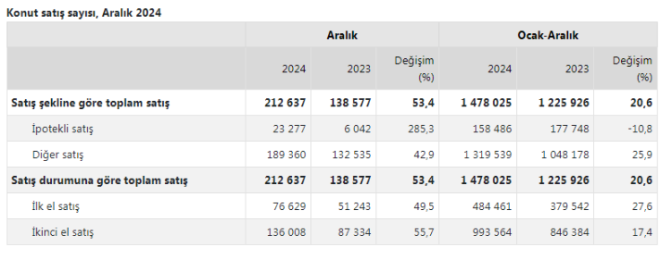 TÜİK, 2024 yılının son ayına ilişkin Konut Satış İstatistiklerini yayımladı. Türkiye genelinde 1 milyon 478 bin 25 konutun satıldığı 2024 yılında satışlar bir önceki yıla göre yüzde 20,6 oranında arttı. Satışların en fazla olduğu iller sıralamasında İstanbul, ülke uyruklarına göre yapılan en konut satışlarında ise Rusya Federasyonu vatandaşları başı çekti.