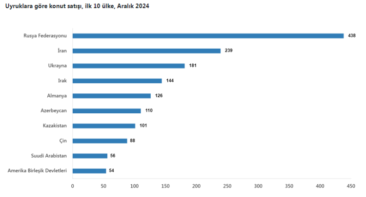 Ülke uyruklarına göre en çok konut satışı Rusya Federasyonu vatandaşlarına yapıldı. 2024 yılında ülke uyruklarına göre en fazla konut satışı sırasıyla 4 bin 867 ile Rusya Federasyonu, 2 bin 166 ile İran ve bin 631 ile Ukrayna vatandaşlarına yapıldı. Aralık ayında ise sırasıyla 438 ile Rusya Federasyonu, 239 ile İran ve 181 ile Ukrayna vatandaşlarına yapıldı.