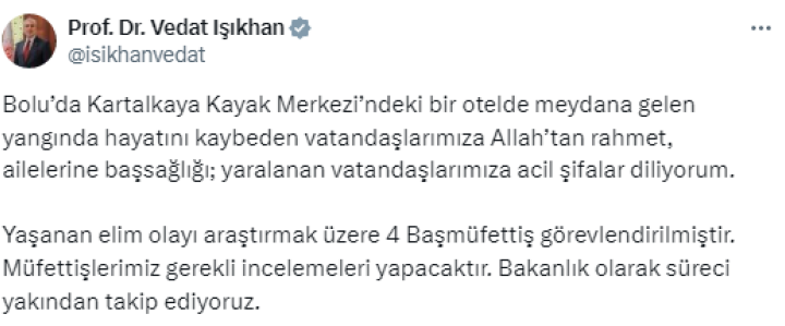 Çalışma ve Sosyal Güvenlik Bakanı Vedat Işıkhan, Bolu Kartalkaya’daki yangınla ilgili 4 başmüfettişin görevlendirildiğini açıkladı. ANKARA (İGFA)...