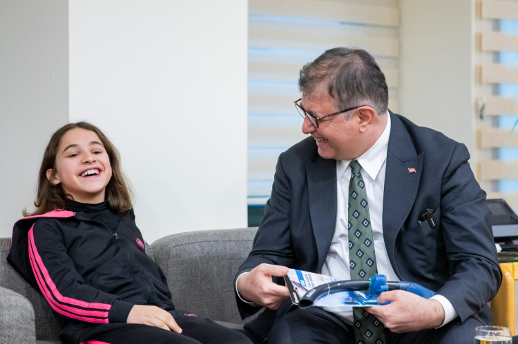 İzmir Büyükşehir Belediye Başkanı Dr. Cemil Tugay, mücadelesi ve azmi ile dikkatleri üzerine çeken başarılı sporcu Miray Korkmaz, annesi Nihal Korkmaz ve antrenörü Mehmet Onur Erküçük ile makamında bir araya geldi.