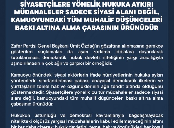 Türkiye Barolar Birliği (TBB), Zafer Partisi Genel Başkanı Ümit Özdağ’ın tutuklanmasıyla ilgili yaptığı yazılı açıklamada, siyasetçilere yönelik...