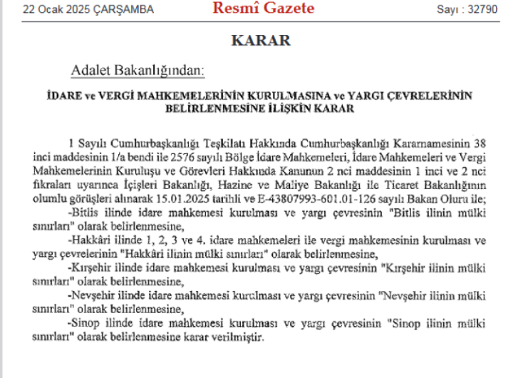 Adalet Bakanlığı, İdare ve Vergi Mahkemeleri kurulmasına ve yargı çevrelerinin belirlenmesine ilişkin kararı bugünkü Resmi Gazete’de yayımladı....
