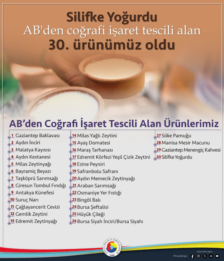 ANKARA (İGFA) – Türkiye Odalar ve Borsalar Birliği (TOBB) Başkanı Rifat Hisarcıklıoğlu, Silifke Yoğurdu’nun Avrupa Birliği’nden aldığı coğrafi işaret tescili ile ilgili paylaşım yaptı.