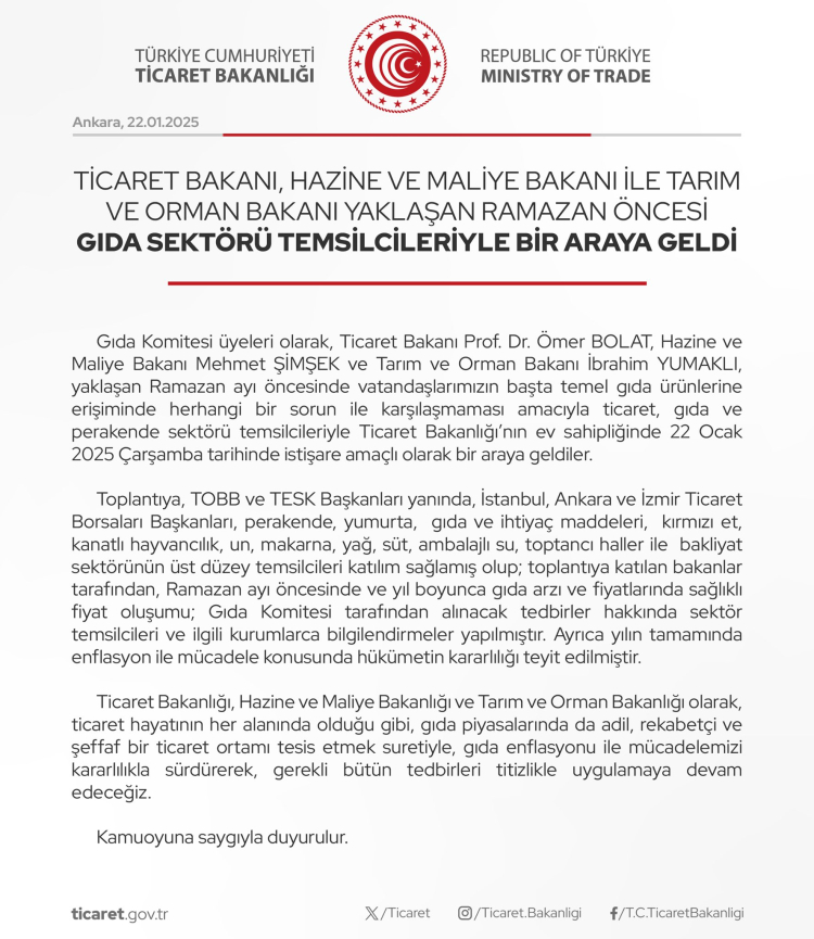 Toplantıda, hükümetin enflasyonla mücadele konusundaki kararlılığı bir kez daha teyit edildi. Ticaret, Hazine ve Maliye ile Tarım ve Orman Bakanlıklarının, gıda piyasalarında adil, rekabetçi ve şeffaf bir ticaret ortamı sağlama hedefi doğrultusunda, tüm gerekli tedbirleri titizlikle uygulamaya devam edeceği ifade edildi.