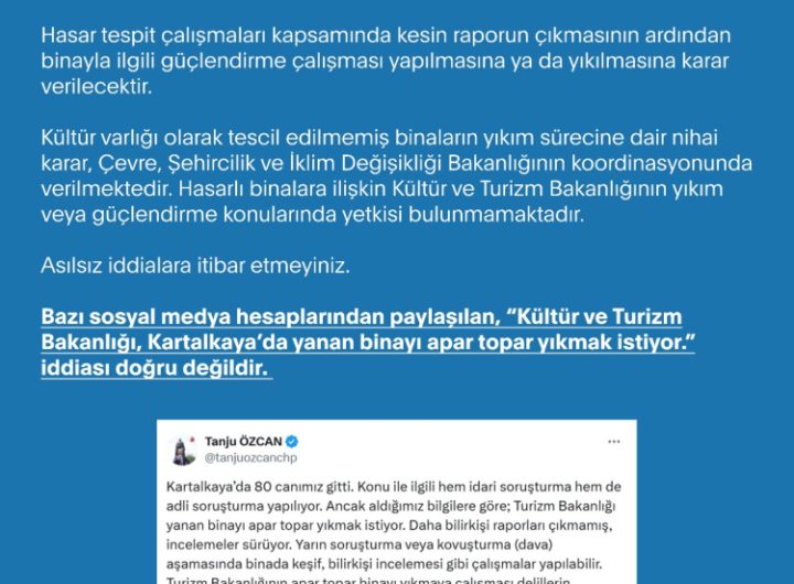 Bazı sosyal medya hesaplarından paylaşılan, “Kültür ve Turizm Bakanlığı, Kartalkaya’da yanan binayı apar topar yıkmak istiyor.” iddiasının...