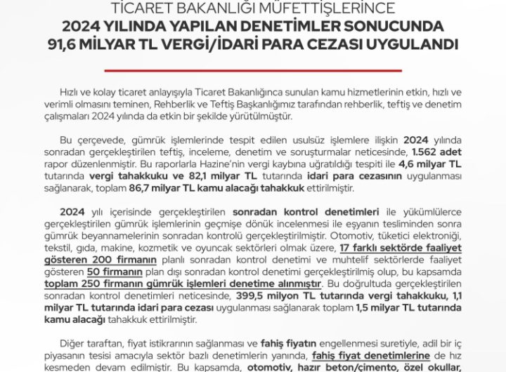 Ticaret Bakanlığı müfettişlerince 2024 yılında yapılan denetimler sonucunda 91,6 milyar TL vergi/idari para cezası uygulandı. ANKARA (İGFA)...
