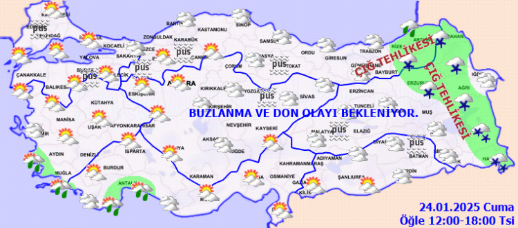 Ülkemizin iç ve doğu kesimlerinde buzlanma ve don ile birlikte pus ve yer yer sis görüleceği tahmin ediliyor. Doğu Karadeniz’in iç kesimlerinin yüksekleri ile Doğu Anadolu’nun yüksek ve dik yamaçlarında çığ tehlikesi bulunmaktadır.