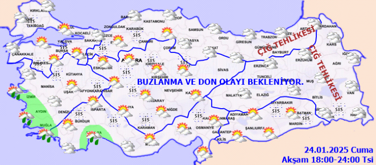 BUZLANMA VE DON OLAYI İLE ÇIĞ TEHLİKESİ UYARISI: Doğu Karadeniz’in iç kesimlerinin yüksekleri ile Doğu Anadolu’nun doğusunun dik ve eğimli yamaçlarında çığ tehlikesi ile yurdun iç ve doğu kesimlerinde buzlanma ve don olayı beklendiğinden ulaşımda meydana gelebilecek olumsuzluklara karşı dikkatli ve tedbirli olunması gerekmektedir.