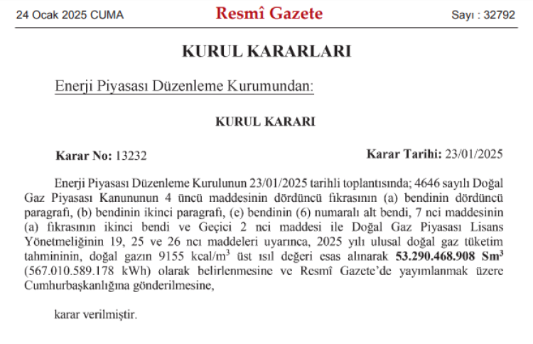 Söz konusu karara göre, tahminin 9 bin 155 kalorik değer metreküp üst ısıl değerine dayanarak hesaplandığı ve yıllık tüketimin 53 milyar 290 milyon 468 bin 908 standart metrküpe tekabül eden 567 milyar 10 milyon 589 bin 178 kWh olarak öngörüldüğü kaydedildi.