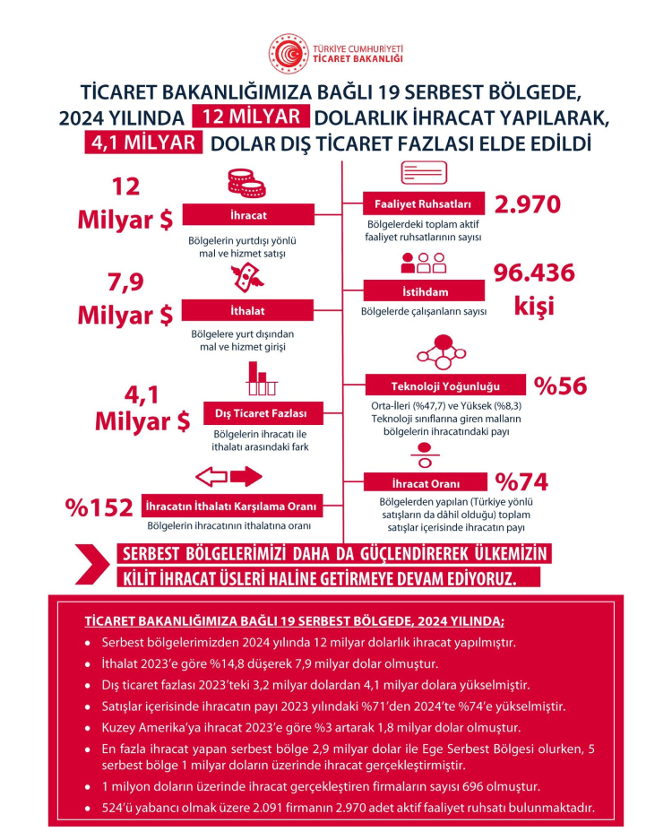 Ticaret Bakanlığı’na bağlı 19 Serbest Bölgede, 2024 yılında 12 Milyar Dolar ihracat yapılarak 4,1 milyar dolar dış ticaret fazlası elde edildi.