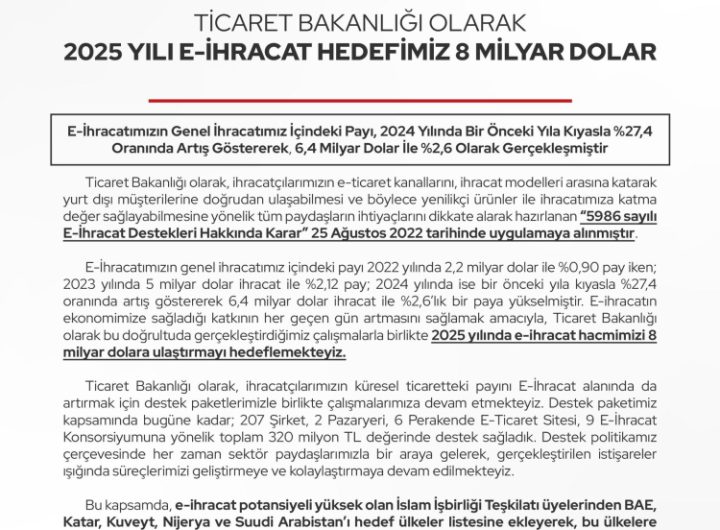Ticaret Bakanlığı, 2025 yılı e-ihracat hedefini 8 milyar dolar olarak açıklarken, e-ihracatın genel ihracat içerisindeki payını 2028...