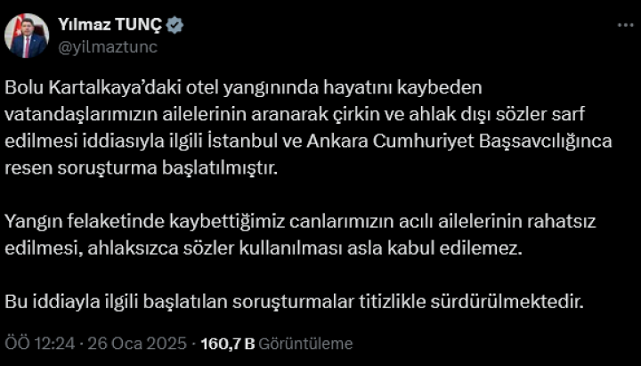 Adalet Bakanı Yılmaz Tunç, Bolu Kartalkaya’daki otel yangınında hayatını kaybeden vatandaşların ailelerinin aranarak çirkin ve ahlak dışı...