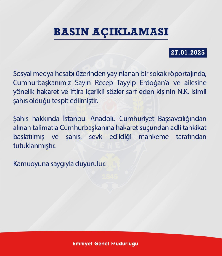 Sosyal medya hesabın üzerinden yayınlanan bir sokak röportajında N.K adlı bir vatandaş, Cumhurbaşkanı Recep Tayyip Erdoğan ve ailesine yönelik hakaret ve iftira içerikli sözlerde bulunmuştu.
