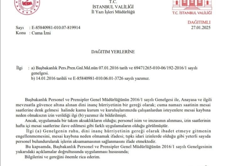 İstanbul Valiliği, kamu kurumlarında Cuma Namazına gitme izinleriyle ilgili problemlerin giderilmesi için yazı gönderdi. İSTANBUL (İGFA) –...