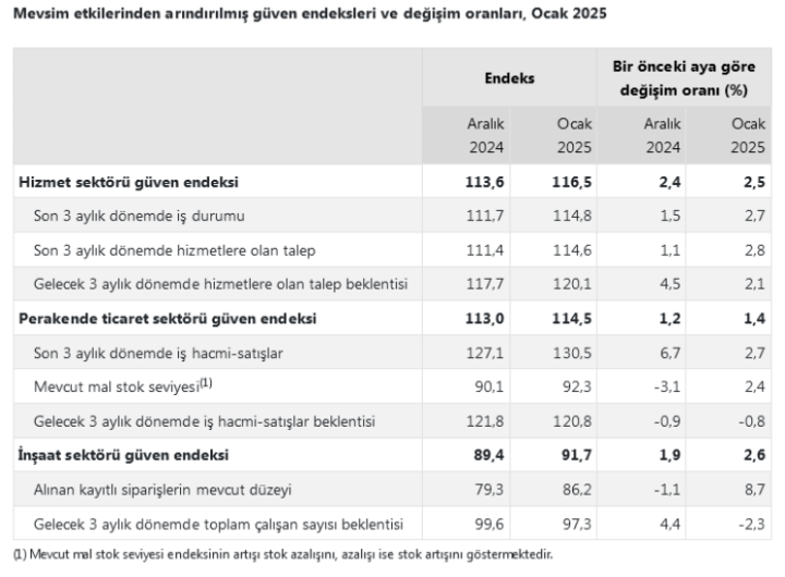 Güven endeksi Ocak ayında hizmet sektöründe yüzde 2,5 artarak 116,5’e, perakende ticarette yüzde 1,4 artarak 114,5’e, inşaatta...