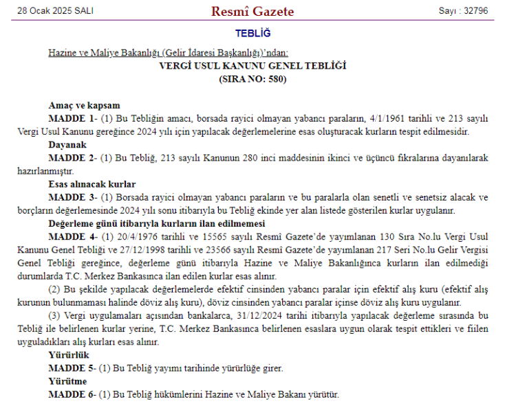 Borsada rayici olmayan yabancı paralar ile senetli, senetsiz alacakla borçların değerlemesinde 2024 yıl sonu itibarıyla uygulanacak kurlar belirlendi.