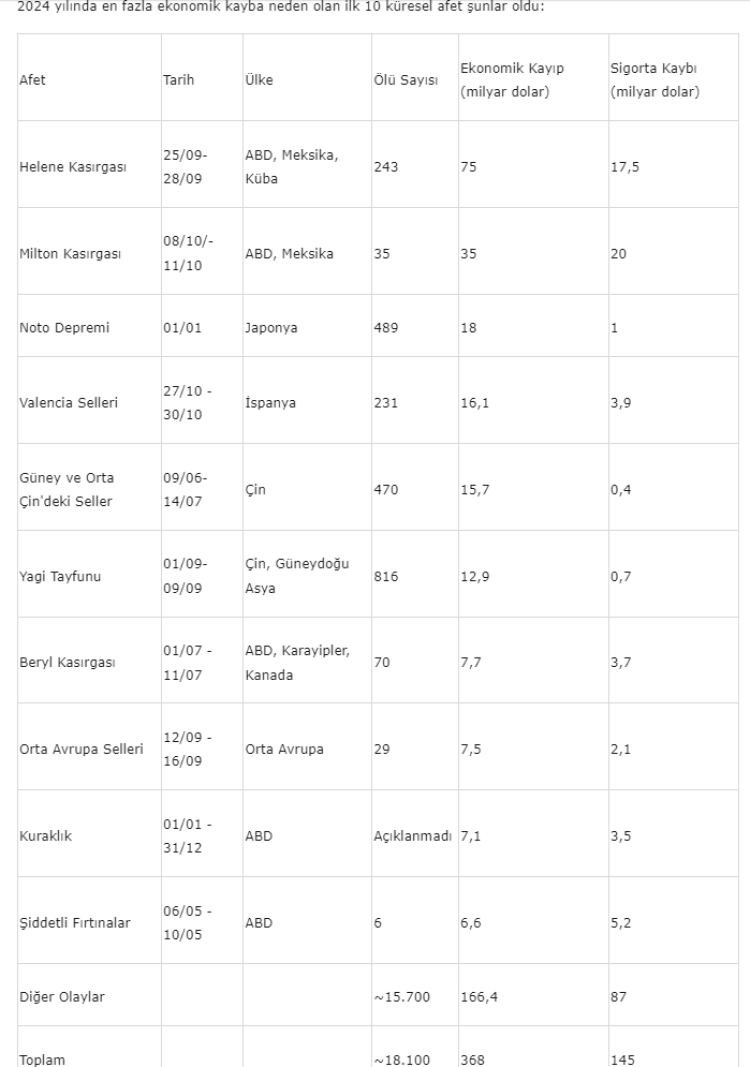 2024 yılında doğal afetlerden kaynaklanan küresel ekonomik kayıplar 368 milyar dolar oldu. Geçen yılın Eylül ayında ABD kıyılarına ulaşan Helene Kasırgası, 75 milyar dolarlık zarara ve 243 kişinin hayatını kaybetmesine neden olmuştu.