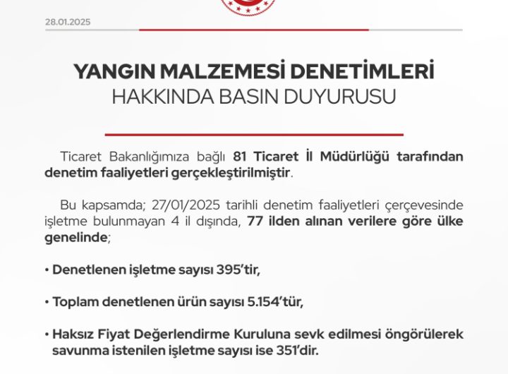 Ticaret Bakanlığı’nın ülke genelinde yangın malzemelerine yönelik gerçekleştirdiği 395 işletme denetiminde 351 işletme Haksız Fiyat Değerlendirme Kurulu’na...