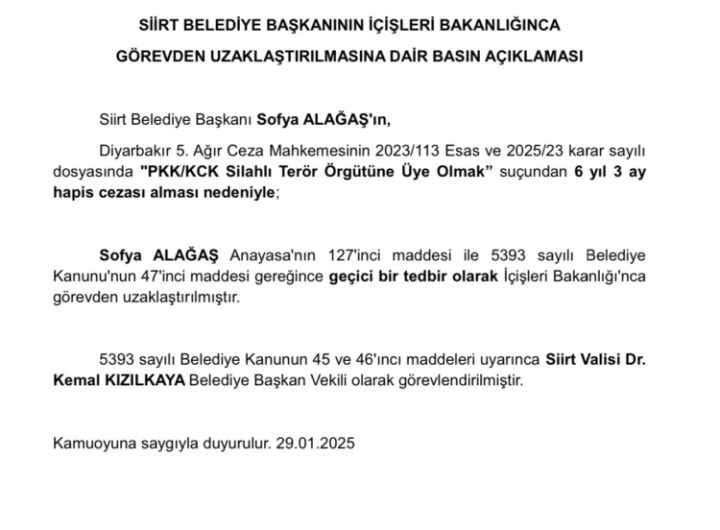 Siirt Belediye Başkanı Sofya Alağaş’ı 6 yıl 3 ay hapis cezası dolayısıyla görevden uzaklaştıran İçişleri Bakanlığı, Siirt...