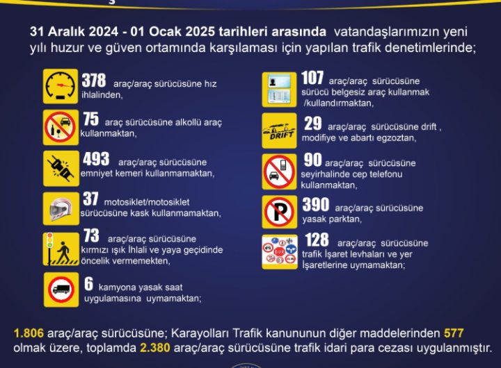 Bursa Emniyet Müdürlüğü, yılbaşı gecesi ve ertesi gününde yaptığı trafik denetimlerine ilişkin verileri özetledi. BURSA (İGFA) – Bursa...