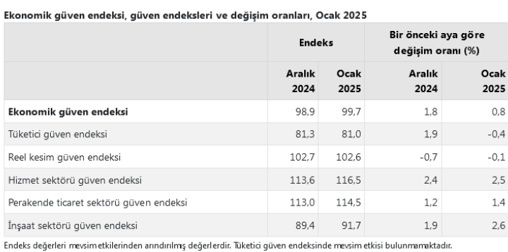 Ekonomik güven endeksi Aralık ayında 98,9 iken, Ocak ayında yüzde 0,8 oranında artarak 99,7 değerini aldı. ANKARA...