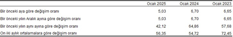 TÜFE’deki (2003=100) değişim 2025 yılı Ocak ayında bir önceki aya göre yüzde 5,03, bir önceki yılın Aralık ayına göre yüzde 5,03, bir önceki yılın aynı ayına göre yüzde 42,12 ve 12 aylık ortalamalara göre yüzde 56,35 olarak gerçekleşti.