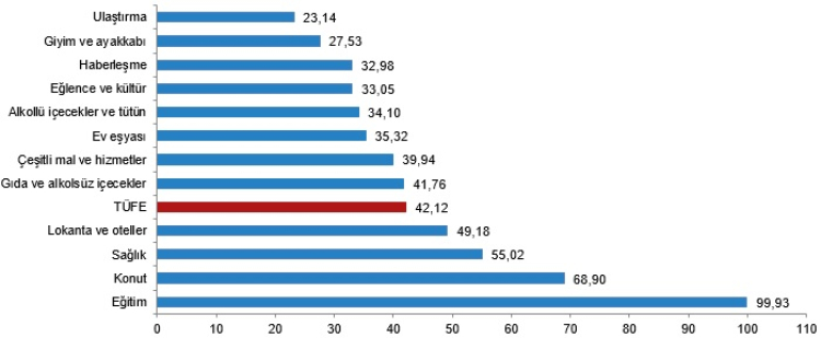 Bir önceki yılın aynı ayına göre en az artış gösteren ana grup yüzde 23,14 ile ulaştırma oldu. Buna karşılık, bir önceki yılın aynı ayına göre artışın en yüksek olduğu ana grup ise yüzde 99,93 ile eğitim oldu.