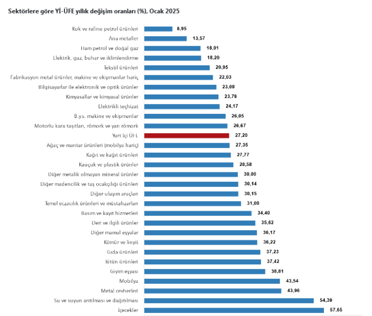 TÜİK, Ocak ayına ilişkin açıkladığı Yurt İçi Üretici Fiyat Endeksi (Yİ-ÜFE)’ne göre yıllık yüzde 27,20, aylık ise yüzde 3,06 oranında arttırdı.