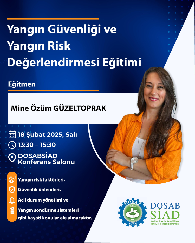 Demirtaş Organize Sanayi Bölgesi Sanayici İş İnsanları Derneği (DOSABSİAD), sanayi tesislerinde güvenliğin artırılması ve olası risklerin minimize edilmesi amacıyla 18 Şubat 2025 Salı günü, “Yangın Güvenliği ve Yangın Risk Değerlendirmesi Eğitimi” düzenleyerek firmaları bilinçlendirecek.