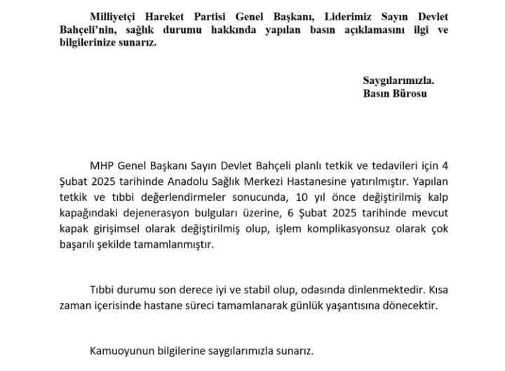 MHP Genel Başkanı Devlet Bahçeli’nin kalp kapakçığı yenilendi. Bahçeli’nin sağlık durumunun iyi olduğu öğrenildi. ANKARA (İGFA) –...