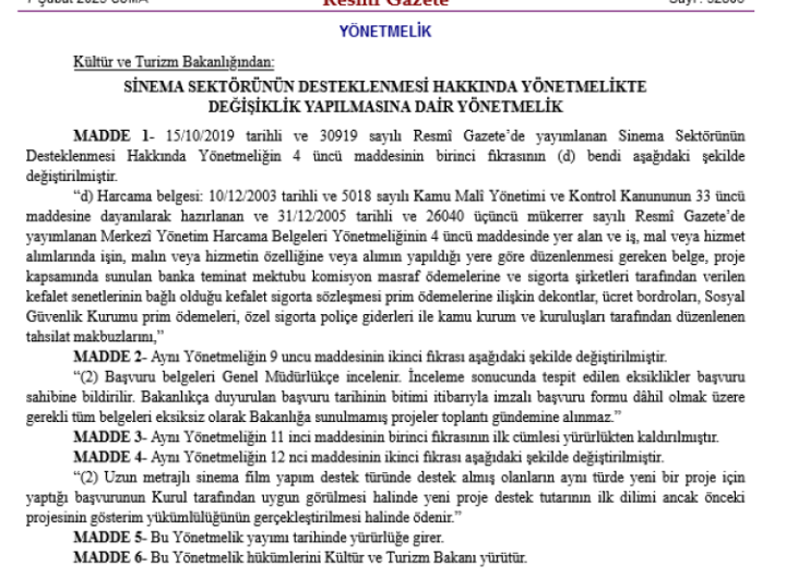 Kültür ve Turizm Bakanlığı, Sinema Sektörünün Desteklenmesi Yönetmeliği’nde değişiklik yaparak harcama belgeleri genişletildi. Eksik belgelerle başvuruların kabul...