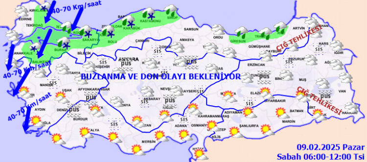 Gece ve sabah saatlerinde iç ve doğu kesimlerde buzlanma ve don ile birlikte pus ve yer yer sis bekleniyor. Doğu Karadeniz’in iç kesimlerinin yüksekleri ile Doğu Anadolu’nun yüksek ve dik yamaçlarında çığ tehlikesi bulunmaktadır.
