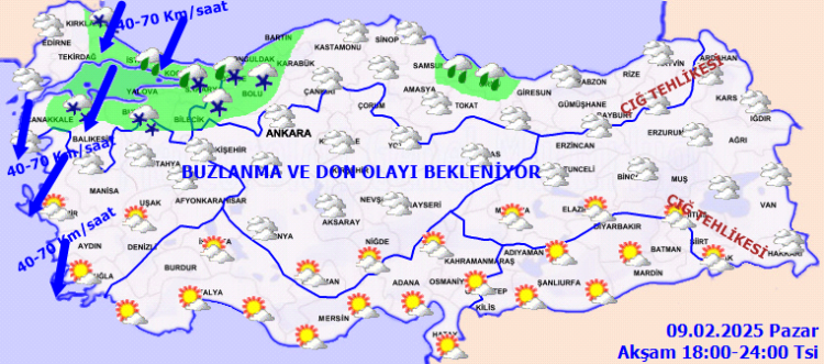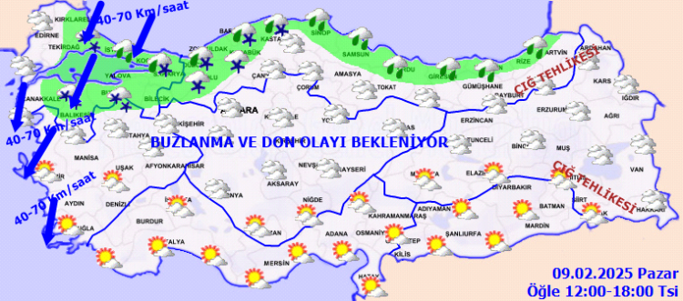 Gece ve sabah saatlerinde iç ve doğu kesimlerde buzlanma ve don ile birlikte pus ve yer yer sis bekleniyor. Doğu Karadeniz’in iç kesimlerinin yüksekleri ile Doğu Anadolu’nun yüksek ve dik yamaçlarında çığ tehlikesi bulunmaktadır.