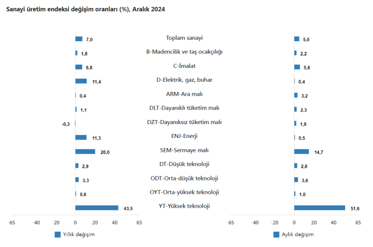 Yıllık bazda yüzde 7,0 artışın kaydedildiği sanayi üretim endeksi verilerine göre sanayinin alt sektörleri (2021=100 referans yıllı) incelendiğinde; 2024 yılı Aralık ayında madencilik ve taş ocakçılığı sektörü endeksi bir önceki yılın aynı ayına göre yüzde 1,8 arttı. Verilere göre İmalat sanayi sektörü endeksi yüzde 6,8 artış kaydederken, elektrik, gaz, buhar ve iklimlendirme üretimi ve dağıtımı sektörü endeksi yüzde 11,4 oranında arttı.