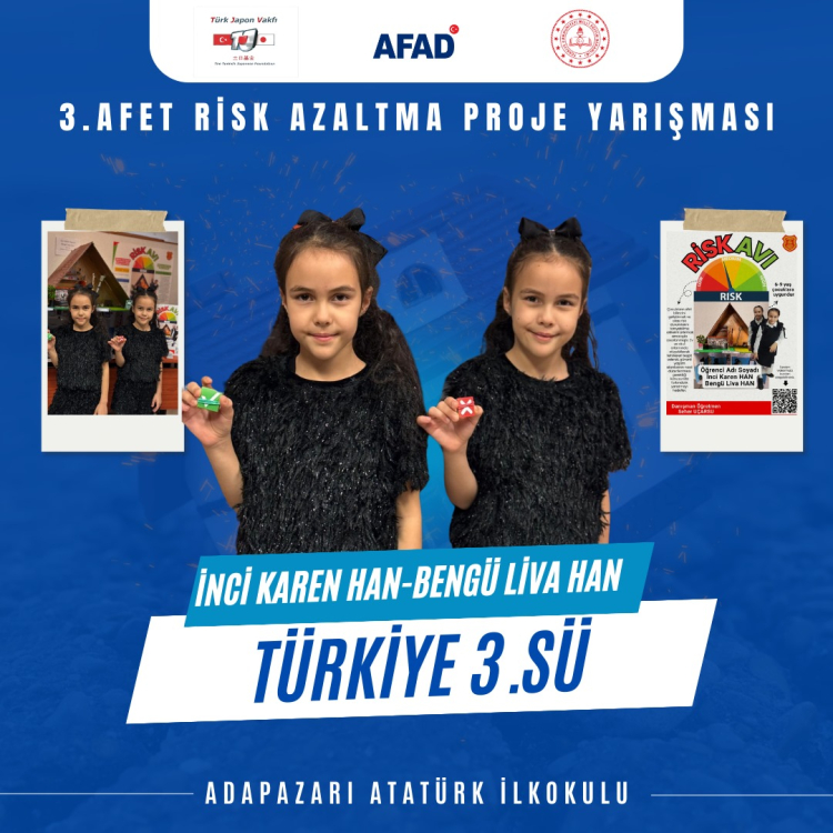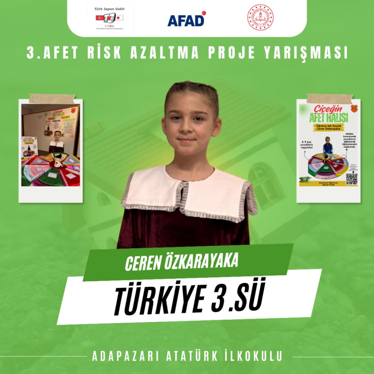 Adapazarı Atatürk İlkokulu’ndan danışmanlığını Seher Uçarsu’nun yaptığı 3.sınıf öğrencilerinden İnci Karen Han ve Bengü Liva Han “Risk Avı”; danışmanlığını Mesut Fidan’ın yaptığı 3. sınıf öğrencisi Ceren Özkara Yaka “Çiçeğin Afet Halısı” ve danışmanlığını Ergül Şahin’in yaptığı 2. sınıf öğrencisi AyzaPazaşoğlu “Bir Bilmece Bir Afet” projesiyle Türkiye 3.lüğünü kazandılar.