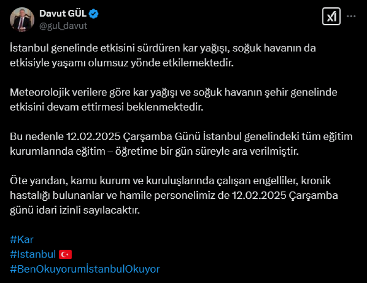 Vali Gül, meteorolojik verilere göre kar yağışı ve soğuk havanın şehir genelinde etkisini devam ettirmesi beklendiğinden dolayı 12 Şubat Çarşamba Günü İstanbul genelindeki tüm eğitim kurumlarında eğitim öğretime bir gün süreyle ara verildiği belirtildi.