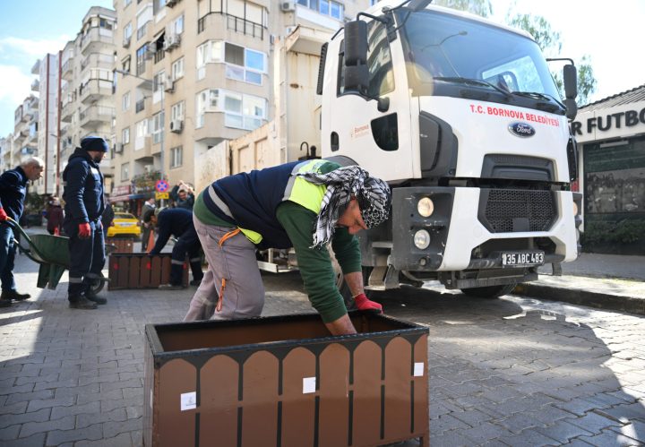 İzmir’de Bornova Belediyesi, Zafer Caddesi’nde trafik akışını düzenlemek ve düzensiz parkı önlemek amacıyla geçici orta refüj çalışması...