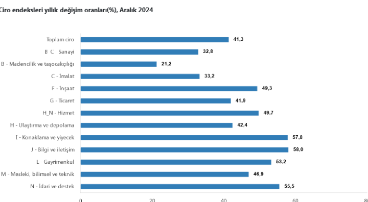 Sanayi, inşaat, ticaret ve hizmet sektörleri toplamında ciro endeksi (2021=100), 2024 yılı Aralık ayında yıllık yüzde 41,3...