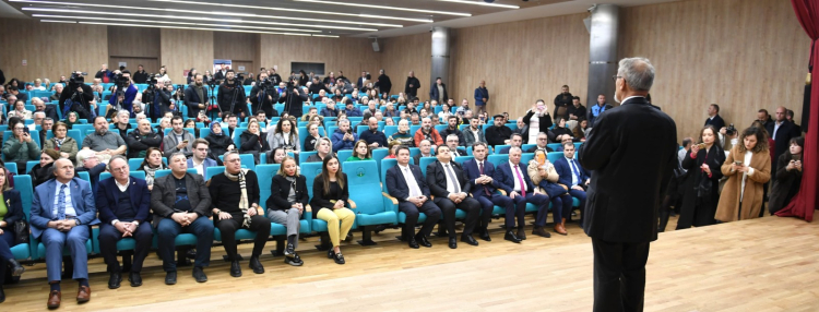 Başkan Aydın, söyleşinin ardından Prof. Dr. Görür’e teşekkür plaketi takdim etti.
