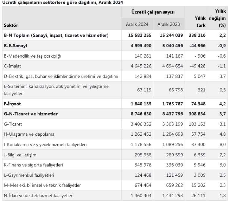 Sanayi, inşaat ve ticaret-hizmet sektörleri toplamında ücretli çalışan sayısı bir önceki yılın aynı ayında 15 milyon 244 bin 39 kişi iken, 2024 yılı Aralık ayında 15 milyon 582 bin 255 kişi oldu.