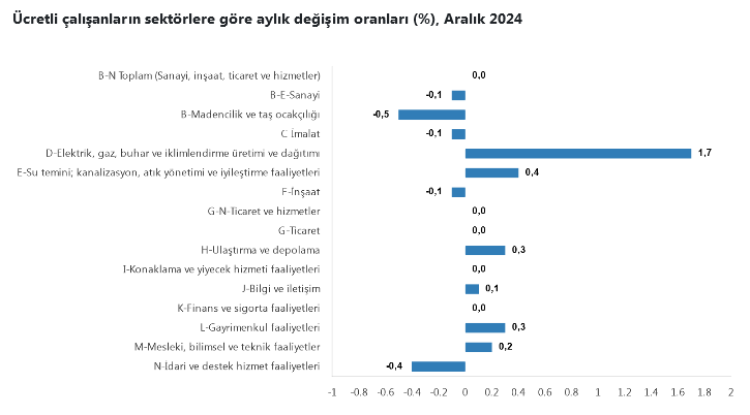 Sanayi, inşaat ve ticaret-hizmet sektörleri toplamında ücretli çalışan sayısı bir önceki yılın aynı ayında 15 milyon 244 bin 39 kişi iken, 2024 yılı Aralık ayında 15 milyon 582 bin 255 kişi oldu.