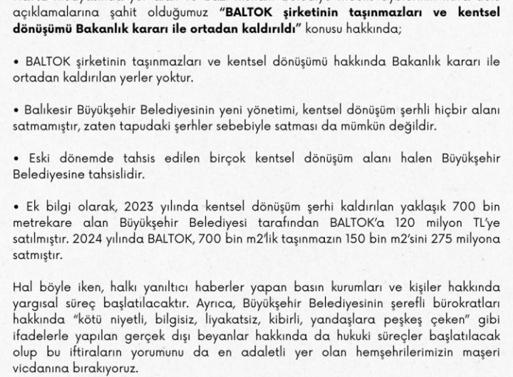 Balıkesir Büyükşehir Belediyesi, BALTOK iddialarına yanıt verdi. BALIKESİR (İGFA) – Balıkesir Büyükşehir Belediyesi’nden havuz medyasında yer alan...