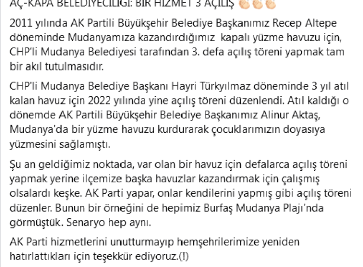 Bursa’nın Mudanya ilçesinde 2011 yılında döneminde AK Partili Büyükşehir Belediye Başkanı Recep Altepe’nin ilçeye kazandırdığı kapalı yüzme...