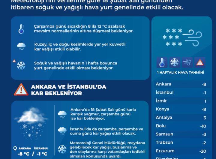 Çevre, Şehircilik ve İklim Değişikliği Bakanlığı’na bağlı Meteoroloji Genel Müdürlüğü’nün son değerlendirmelerine göre 18 Şubat Salı gününden...