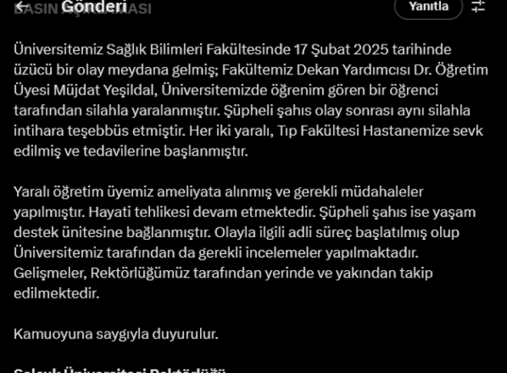Konya’da Selçuk Üniversitesi Sağlık Bilimleri Fakültesi’nde yaşanan üzücü olayda Dekan Yardımcısını silahla yaralayan öğrenci intihara teşebbüs etti....