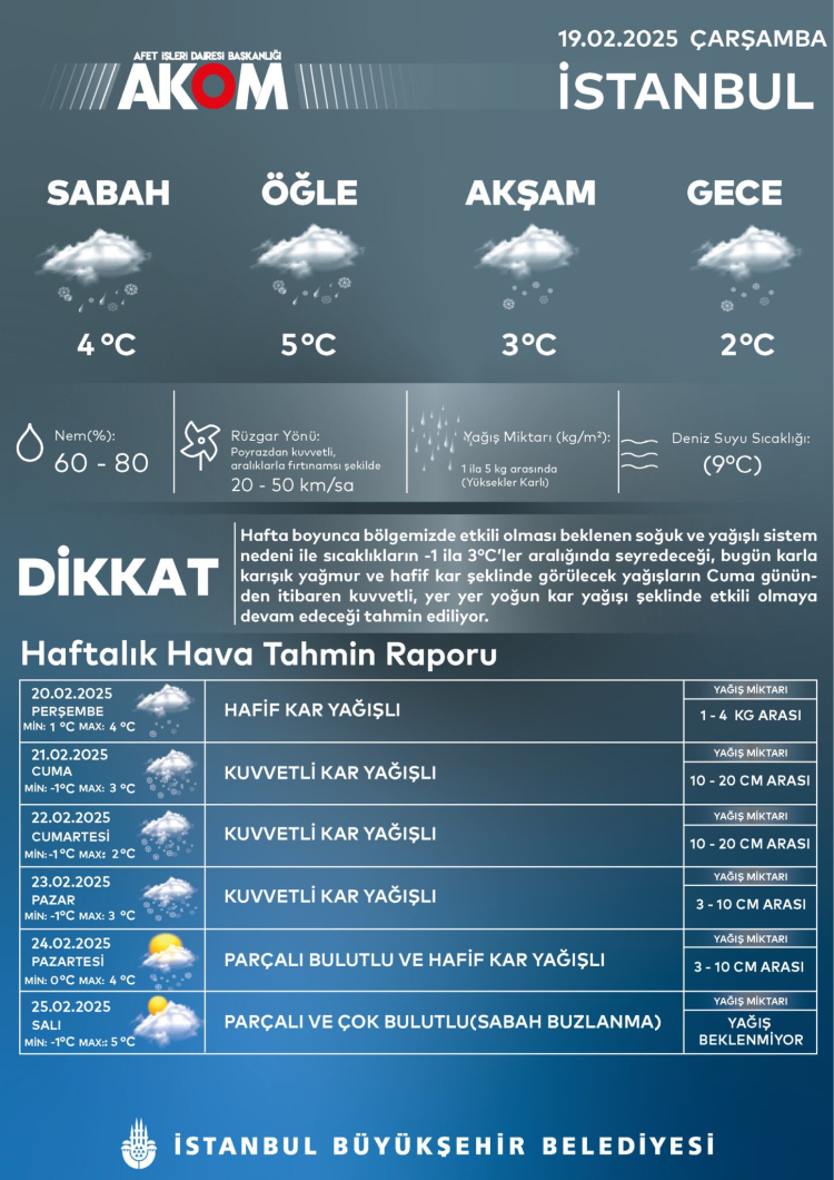 Afet İşleri Daire Başkanlığı AKOM’dan İstanbullulara çağrıda bulunan İstanbul Büyükşehir Belediye Başkanı Ekrem İmamoğlu ise, bu gece hava sıcaklığının daha da düşeceği, kar yağışının daha da artacağı ve buzlanma ile don vakalarının artacağına dikkati çekerek, “Zorunlu olmadıkça kesinlikle şahsi araçlarınızla trafiğe çıkmayınız” uyarısında bulundu.